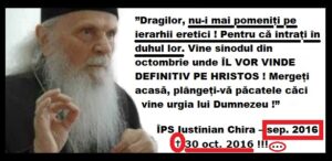 Această proorocire a Pr. Arhim. Justin Pârvu – ”În 3 ani, păstorii voștri vă vor vinde…” a făcut-o cu puțin timp înainte de a trece la Domnul (16 iunie 2013). În data de 16.06.2016, deci după FIX 3 ani, a început pseudo-sinodul din Creta, unde s-a oficializat, s-a concretizat, s-a semnat MAREA LEPĂDARE DE HRISTOS, de Biserica Lui cea Una, Sfântă, Sobornicească și Apostolească – cea Ortodoxă.