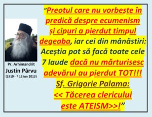 „Ecumenismul? Erezia tuturor ereziilor! Căderea Bisericii prin slujitorii ei. Numai putregaiul cade din Biserica Ortodoxa”.