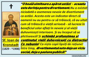 O boală uimitoare a apărut astăzi – aceasta este dorința pentru divertisment. Nu a existat niciodată o asemenea nevoie de divertisment ca astăzi. Acesta este un indicator direct că oamenii nu au pentru ce să trăiască, că au uitat cum să trăiască o viață serioasă – să lucreze în beneficiul celor aflați în nevoie și al vieții duhovnicești interioare. Și au început să se plictisească! Și schimbă profunzimea și conținutul vieții duhovnicești cu distracția! Ce nebunie! Ca niște copii lipsiți de rațiune! Între timp, divertismentul este deja un viciu social, deja o pasiune publică!