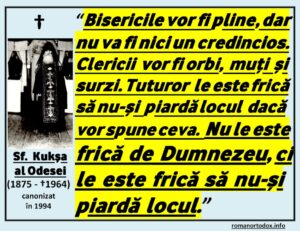 Cu foarte puține excepții, clerul ”ortodox” român (de la patriarh la ultimul monah), TACE COMPLICE în loc să mărturisească ferm, curajos, împotriva păcatului (care a ajuns astăzi să metastazeze întreaga societate, mai mult decât oricând, prin multiple forme și înfățișări prea-viclene, de multe ori sub masca binelui, comodității, iubirismului/ecumenismului):