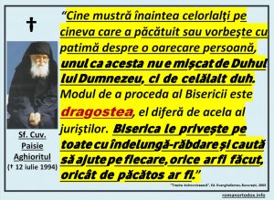Dragoș : Da. Sper că și Părinții noștri vor avea discernământ și înțelepciune și vor înțelege clar lucrarea pe care o face Părintele Ciprian cu această manipulare, cu aceste acuzații false și cu schisma pe care o creează în Biserică. Și, ceea ce am observat și eu, deoarece Părintele Ciprian se călăuzește de fapt după zvonuri, și nu după fapte, atunci cum poate el, ca duhovnic, să spovedească o persoană, când persoana aceea spune: nu am făcut acest lucru, iar el ca duhovnic vine și spune: tu spui că nu ai făcut un anumit lucru, dar știu că în adâncul inimii tale l-ai făcut, deci nu te cred, nu îți dau Împărtășanie, pentru că ești un mincinos, pentru că nu iau în considerare ceea ce spui tu la spovedanie, iau în considerare ceea ce este în inima ta?!