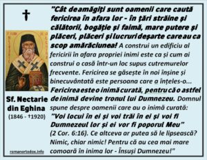 „Cât de amăgiți sunt oamenii care caută fericirea în afara lor – în țări străine și călătorii, bogăție și faimă, mare putere și plăceri, plăceri și lucruri deșarte care au ca scop amărăciunea! A construi un edificiu al fericirii în afara propriei inimi este ca și cum ai construi o casă într-un loc supus cutremurelor frecvente. Fericirea se găsește în noi înșine și binecuvântată este persoana care a înțeles-o… Fericirea este o inimă curată, pentru că o astfel de inimă devine tronul lui Dumnezeu. Domnul spune despre oamenii care au o inimă curată: „Voi locui în ei și voi trăi în ei și voi fi Dumnezeul lor și ei vor fi poporul Meu” (2 Cor. 6:16). Ce altceva ar putea să le lipsească? Nimic, chiar nimic! Pentru că au cea mai mare comoară în inima lor – Însuși Dumnezeu!”